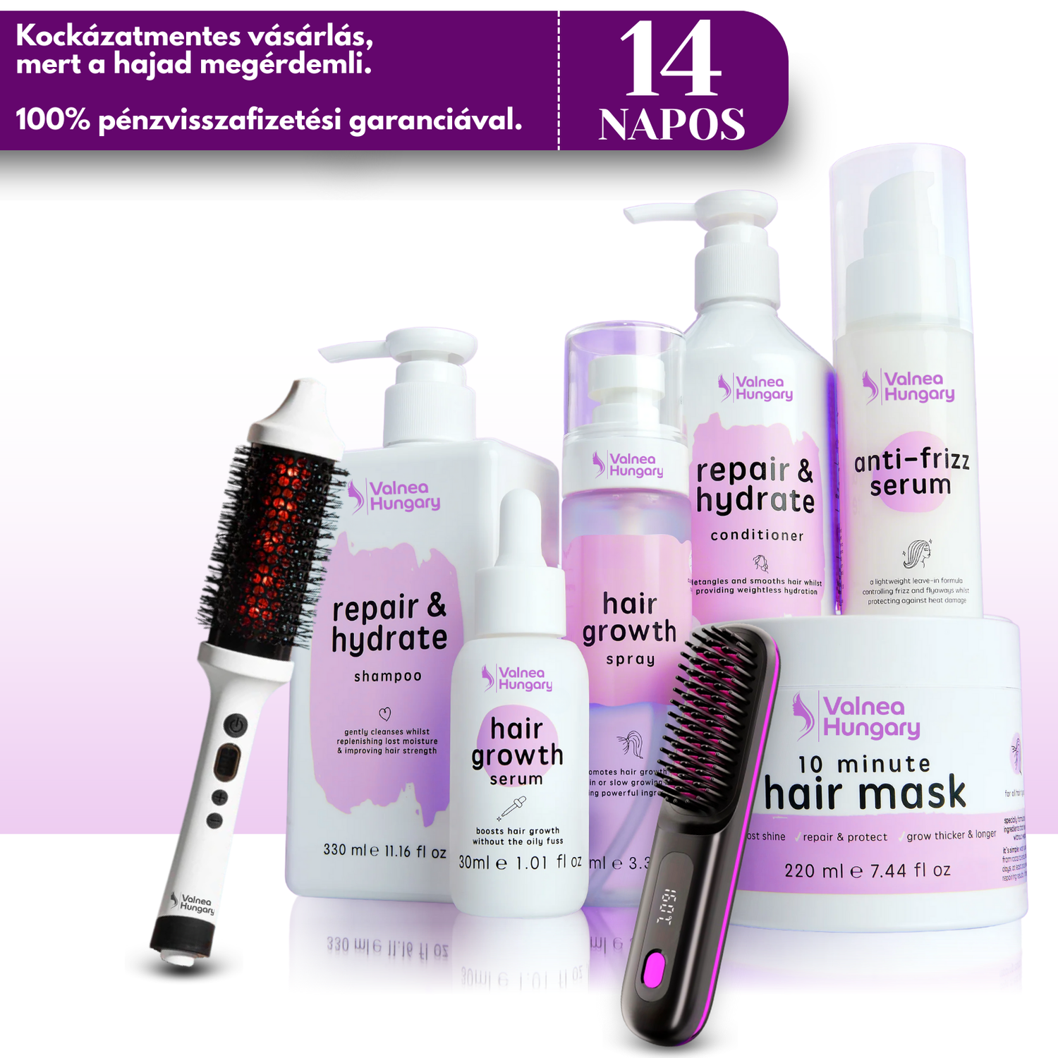 Próbáld ki a Valnea termékeit teljes nyugalommal! Hiszünk abban, hogy hajad már az első használat után visszanyeri egészséges fényét és tartását, mintha épp most léptél volna ki a fodrászszalonból. Célunk a te magabiztosságod, ezért minden rendelésedre 100% elégedettségi garanciát vállalunk: ha nem vagy maradéktalanul boldog az eredménnyel, 14 napon belül kérdés nélkül visszatérítjük a vételárat.